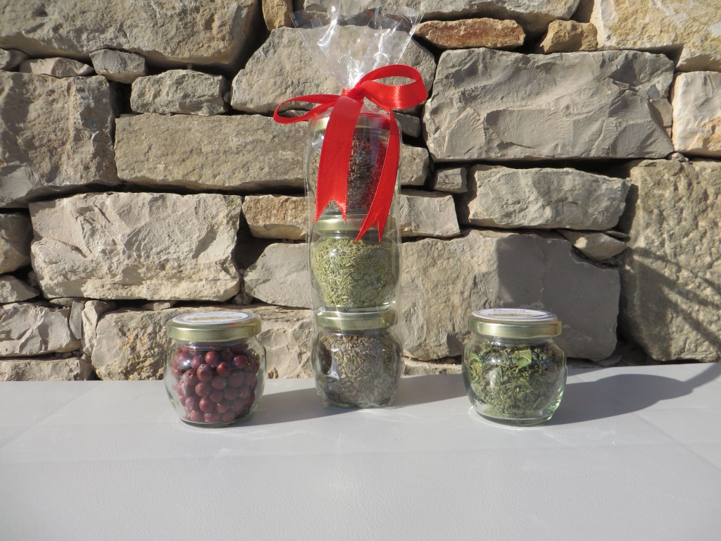 Description: 500 ml bottle of olive oil including pouring spout, 100 g pouch of pralines, 250 g glass jar of jam to be selected, 1 jar of aromatic herbs to be selected.